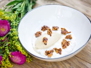 Wine & Crab Летние фрукты вдохновляют поваров на создание самых разных и причудливых десертов. Братьев Березуцких больше всего заинтересовали сливы, и они изобрели базиликовую панакоту с ломтиками сливы и чипсами с черным кунжутом.