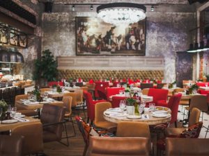 Богемный эклектичный интерьер создан известным бюро NB-Studio Натальи Белоноговой и чем-то напоминает «Уголек». Стены с необработанной кирпичной кладкой и высокие бетонные потолки с арматурными конструкциями соседствуют с массивными коваными люстрами ручной работы и картинами современных художников. Урбанистический стиль компенсируется деревянными столами, полом из дуба, местами выложенным фактурной каменной плиткой. За приятное освещение отвечают раздвижные высокие окна и многочисленные светильники: стеклянные — в виде бутылок — и металлические.