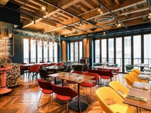 Пространство получилось довольно холодным, из теплых красок — только дерево в отделке, ярко-желтые кресла да металлическая фурнитура. Зато рассадка не слишком плотная, а второй этаж однозначно более выигрышный, чем первый. Нижний уровень получился слишком темным и немного угрюмым из-за серых стен и нависающего потолка, в то время как верхний зал светлый и уютный.