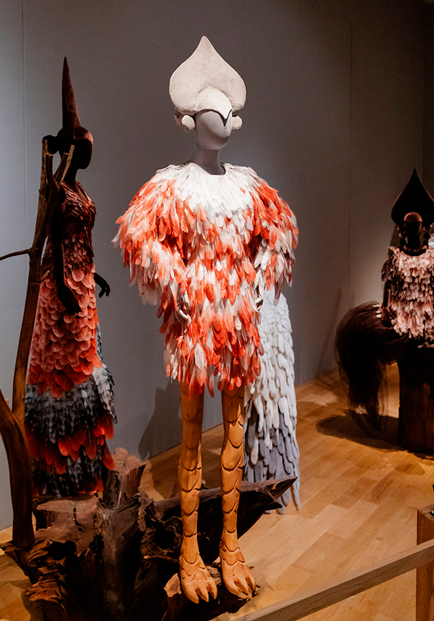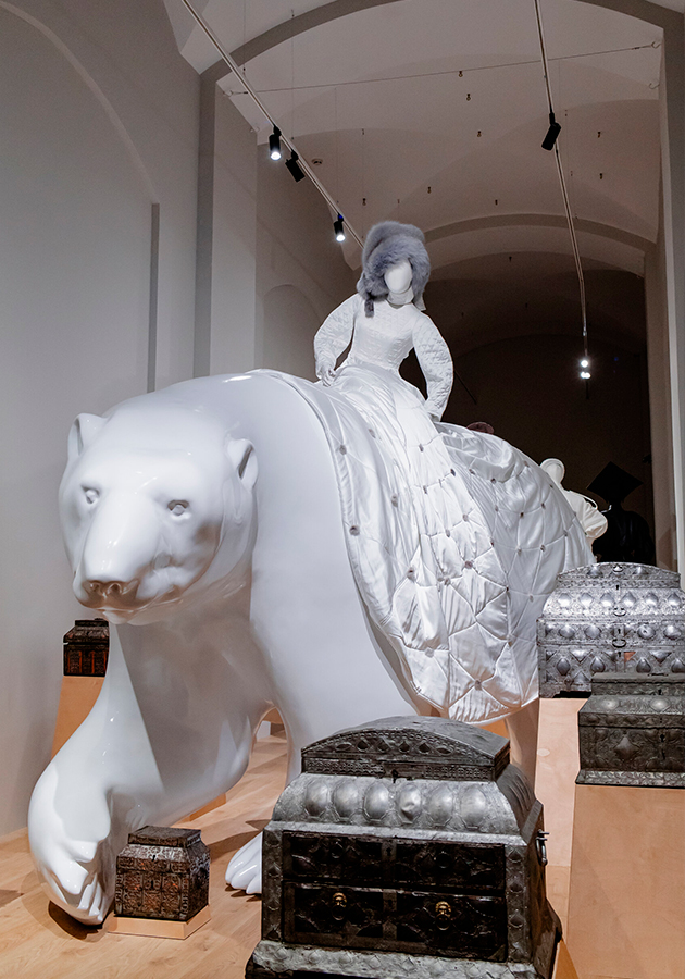 Начиная с инсталляции «Медведь и дружина», выставка ведет через «Изразцовый зал» в зал «Зачарованные», а оттуда — в зал «Женщин-птиц» и жемчужное пространство. Помимо кутюрных работ и арт-объектов, которые были созданы специально для проекта, на экспозиции представлены масштабные произведения прикладного искусства из коллекции Исторического музея — резные наличники, кованые сундуки, расписные изразцы, кокошники и старинные орудия труда.
