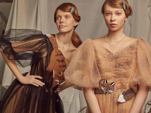 Дизайнер решительно смешивает ультимативную женственность 1950-х годов, воплощенную при помощи тугих корсетов и пышных юбок, со сдержанной элегантностью 1960-х и иронией 1970-х, разбавляя этот и без того многослойный коктейль отсылками к фольклору, этнике и даже авангарду начала ХХ века.
