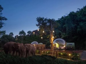На специальной деревянной террасе-помосте в отеле установили пузыри из высокотехнологичной полиэфирной ткани с использованием эксклюзивной технологии Precontraint Serge Ferrari. Она абсолютно прозрачная, так что постояльцы могут наблюдать за происходящим снаружи, не вставая с постели. Только представьте: ясное небо над головой, слоны неспешно щиплют травку буквально в паре метров и молчат о чем-то важном… А какие восходы и закаты можно наблюдать из номера-пузыря! Удовольствие провести время в инновационном номере обойдется чуть больше 580 долларов за ночь на двоих. В цену включено круглосуточное обслуживание, ужин, мини-бар. Номер площадью 22 кв. м вместил спальню с кроватью king-size, гостиную, непрозрачный санузел. Стильная мебель и система кондиционирования воздуха дополняют обстановку. Все, как в хорошем отеле: халаты и тапочки, туалетные принадлежности, все необходимое для приготовления чая-кофе, регулярная смена постельного белья. Ваш персональным рай в джунглях в компании слонов! Несмотря на всю свою «люксовость», курорт Anantara в первую очередь остается пространством, где бок о бок и без конфликтов могут находиться люди и животные. На территории 650 кв. м работают специалисты, стремящиеся сохранить популяцию слонов. К полезной деятельности приглашают присоединиться и постояльцев. В том числе и финансово. Кстати, кататься на слонах тут нельзя!