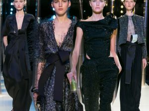 Бамбук стал лейтмотивом всей коллекции, возникая то в качестве принта, украшающего романтические костюмы, подверженные азиатском влиянию (тут и пояса-«оби», и жакеты, напоминающие укороченные кимоно), то в качестве объемных аппликаций и вышивок, украшающих воздушные коктейльные и вечерние платья, выполненные в приглушенной гамме: оттенках серебра и золота и богатой палитре синих цветов. Плиссировки, кружево и сетка, инкрустация камнями и бисером, цветные кристаллы, перья и золотая нить — богатство декора меркло на фоне сложного авторского кроя, визитной карточки Armani Prive. Нотки футуризма — еще одной излюбленной темы кутюрье — нашли воплощение в объемных клатчах из прозрачного плексигласа и массивной бижутерии: в основном, браслетах и серьгах.