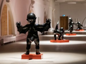 Первая персональная выставка молодого художника Ивана Горшкова занимает все экспозиционное пространство ММОМА на Гоголевском бульваре. Ее название — «Фонтан всего» — как нельзя лучше выражает суть проекта. Скульптуры, инсталляции и живопись Горшкова являют собой абсолютную анархию образов, которые художник в дадаистской и сюрреалистической манере соединяет без всякой иерархии. Антропо- и зооморфные монстры не вызывают ни отторжения, ни страха. Скорее любопытство: как устроены эти странные существа и их мир. «Фонтан всего» — это именно что целый мир со своей системой взаимосвязей и внутренней логикой, которая тем не менее постоянно ускользает от зрителя, а ее поиски и составляют главную интригу выставки. Надувные фигуры то и дело меняют форму, а вроде бы реалистичные персонажи и предметы коллажей, помещенные в абсурдистский контекст, лишаются всякой связи с привычной нам реальностью. В этой тотальной инсталляции вы не найдете ни одной экспликации или названия работ, кроме, собственно, единственной кураторской фразы о том, что никаких пояснительных текстов выставка не предполагает. Оставьте угрызения совести по поводу того, что чего-то не понимаете, просто включайтесь в игру — ведь суть именно в ней.