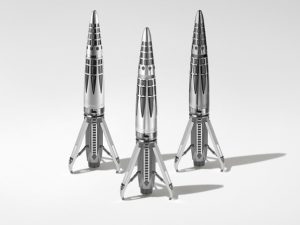 Идея «Астрографа» родилась у Максимилиана Бюссера 4 года назад: именно столько времени понадобилось мастерам Caran d’Ache, чтобы воплотить в жизнь этот неординарный и технически сложный проект. Результатом творческих поисков команды стала уникальная ручка-ракета с футуристическим дизайном и массой технических инноваций, в том числе системой вертикальной стабилизации с блокировкой. На «борту» ракеты, силуэт которой подчеркнут знаковым для Caran d’Ache ячеистым узором, — хитроумный механизм, напоминающий систему раскрытия лезвия в автоматических ножах с блокировкой: миниатюрный рычаг — а именно встроенный в кольцо корпуса — при нажатии одновременно выпускает все три опоры. Также в набор с ракетой входит фигурка астронавта, которая легко фиксируется на поверхности пишущего инструмента. Пишет такая ракета при помощи пера из 18-каратного родированного золота. Этот тот случай, когда слова — действительно на вес золота!