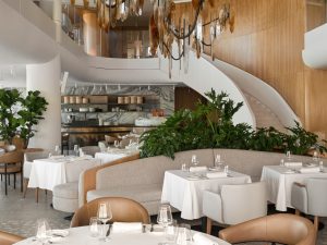 Итак, начнем с интерьера нового проекта Антона Пинского, Виталия Истомина и Артема Лосева. «В ее чертоги ведут широкие мраморные лестницы, спускающиеся каскадом как горные реки. Ее люстры, словно сияющие браслеты, переливаются, отражаясь в рисунках камня и поверхностях столов. Ее взгляд простирается далеко, каждый день встречая рассветы и провожая закаты. Аврора — богиня утренней зари — подарила свое имя нашему новому ресторану. И без единого выстрела произвела фурор, напомнив историю другой харизматичной «Авроры».