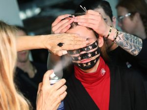 Коллекция Collection 1 демонстрирует любовь дизайнера к Америке: она считывается по банданам, завязанным на головах моделей, по макияжу, вдохновленному полосами и звездами американского флага. «Я думаю, он хотел сделать эту коллекцию очень американской. Александр показывал ее вне Недели моды и хотел, чтобы она всех взволновала. В ней есть спортивная сексуальная одежда, девушка Александра Вэнга одевается сдержанно, хотя она любит надеть свитшот с высокими каблуками», — рассказывает визажист Диана Кендал, которая работала на шоу. У большинства моделей, а в показе участвовали 45 девушек и юношей, кожа была наполнена свежестью. Для этого Диана использовала небольшое количество классических румян Orgasm от Nars и новый бальзам для губ Orgasm Afterglow от Nars. Чтобы не перегружать образ, визажист нанесла тушь только на верхние ресницы. В большинстве показов Alexander Wang встречается жесткий рок-н-ролльный стиль с элементами молодежной культуры. В коллекции SS 2019 это нашло отражение в графичном макияже семи моделей, на лицах которых были изображены трансформированные американские флаги — черные полосы со звездами. Чтобы линии получились четкими, визажисты работали с трафаретами, а сам рисунок наносили бархатными стойкими тенями в стике Velvet Shadow Stick оттенка Flibuste.