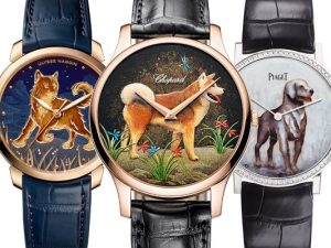 Миниатюрная живопись на циферблате — неотъемлемая составляющая и стиля Jaquet Droz. Эта компания выпустила несколько разных вариантов декора часов Petite Heure Minute к году Собаки — но на них на всех присутствует один и тот же весьма миловидный шпиц. В модели с эмалевым циферблатом цвета слоновой кости и с бриллиантами по безелю шпиц изображен в окружении цветов. В мужской, более сдержанной модели он гуляет среди травы и античных развалин. Есть версии из розового и белого золота, с циферблатами из черного оникса или белого перламутра: шпиц на них выгравирован из драгоценного металла и включен в восточный пейзаж с пагодой.
