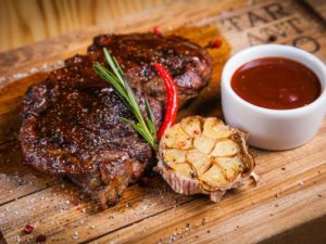 — Тальятта из рибая с рукколой, редисом и соусом песто — Стейк рибай с соусом BBQ (2360 руб. за два блюда);