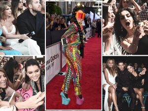 Игги Азалеа тоже не прочь продемонстрировать достоинства, которыми ее щедро наделила природа и, по слухам, опытный пластический хирург. Выбор артистки пал на топ-бюстье и узкую юбку с аппликацией. Розовые волосы и туфли в тон дополняли наряд цвета майского неба, который можно было бы назвать скромным, если бы не прозрачная вставка на бедре, сигнализирующая: в этом сезоне исподнее явно не входит в число must-have западных поп-звезд.