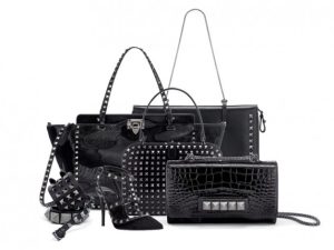 Итог — сумки, клатчи, обувь, перчатки и браслеты, выполненные в черном цвете из различных видов кожи и украшенные темными металлическими шипами.