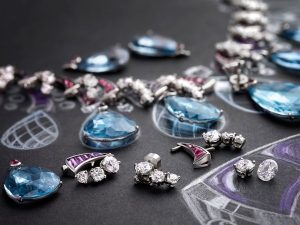 Одним из шедевров, созданных в юбилейный год, стал гарнитур из аквамаринов, сапфиров и бриллиантов, в который вошли колье, серьги и браслет. Камни для комплекта искались в трех разных уголках Земли с тем, чтобы подобрать минералы нужных форм, размера и цвета, позволившие создать идеальную композицию — воплощение эстетического и технического совершенства. Дегарде, на изготовление которого ушло больше года, представляет весь спектр оттенков от нежно-голубого до насыщенно-фиолетового, напоминая драгоценный водопад, переливающийся на свету десятками цветных капель.
