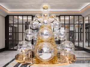 Российская художница-визионер Саша Фролова — мастер перформанса, скульптуры и инсталляции — совместно с благотворительным фондом «Друзья» придумала новогоднюю инсталляцию Sparkle Tree специально для «Карлтон Москва». Это воздушная прозрачная футуристичная скульптура заключает в себе привычную елку золотого цвета, а внешняя оболочка напоминает мыльный пузырь и подчеркивает ощущение мимолетности праздника.