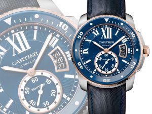 Новые Diver Blue из линии часов для дайвинга Calibre De Cartier стали первыми в коллекции французской марки, безель которых покрыт устойчивой к появлениям царапин керамикой ярко-синего цвета. Ремешок из синей же кожи покрыт каучуком с внутренней стороны, что делает его устойчивым к влаге. Часы водонепроницаемы до 30 бар, а индикаторы и стрелки снабжены светящимся в темноте покрытием. Для удобства спортсменов циферблат снабжен 5-минутными отметками. Новинка представлена в трех цветовых решениях: из розового золота, стали и биколорная модель из стали и розового золота.