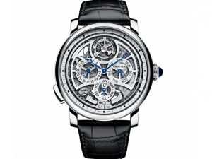 578 компонентов, 5 лет испытаний, 15 недель работы, 10 недель отделки и 5 недель на сборку: самый сложный механизм в истории часового искусства концерна Cartier стал самым ярким экспонатом авторитетной выставки. Секрет модели… в отсутствии секретов: прозрачный корпус обнажает ход времени и позволяет коллекционерам заглянуть в самое «сердце» механизма. Часы самого престижного класса Grande Complications, в которых должны сочетаться как минимум два усложнения уровня турбийона, минутного репетира, вечного календаря и сплит-хронографа, в этом сезоне отличают автоматический механизм толщиной всего 5.49 мм и «деликатный» дизайн, не свойственный моделям такой сложности. Не зря психологи говорят, что время «сжимается»!