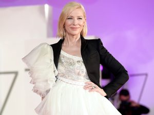 Неудивительно, что на нынешнем Венецианском кинофестивале Бланшетт, возглавившая жюри конкурса, сделала ставку на практичные брючные образы: не платьями в пол едиными живет светская хроника. Для премьеры картины «Любовники» французского режиссера Николь Гарсии Бланшетт выбрала строгий черный низ и броский топ Alexander McQueen — его она, кстати, уже надевала на церемонию BAFTA в 2016-м, и это экологичный жест в ее пользу. На фотоколле членов жюри кинофестиваля Бланшетт появилась в полосатом комбинезоне Giorgio Armani. Брючные образы также составили основу ее «неофициального» гардероба в Венеции.