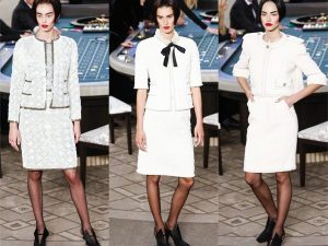 На импровизированном подиуме были расставлены игральные столы, за которыми сидели манекенщицы, а также приглашенные звезды — Джулианна Мур, Рита Ора, Кристен Стюарт, Лили Коллинз и многие другие. Дизайнеру удалось и их сделать полноценными участниками шоу, превратив каждое появление знаменитостей в импровизированное дефиле. Между столиками, где шла напряженная игра в рулетку, лавировали модели, демонстрируя коллекцию haute couture осенне-зимнего сезона. Традиционно, показ открыла линейка костюмов в различных вариациях — из стеганных тканей в насыщенной гамме, твида, кружева, матовой кожи, шерсти букле: классика жанра, которая, вероятно, никогда не выйдет из моды и не растеряет своего ретро-очарования, а потому транслирующаяся из сезона в сезон. Следующий блок был представлен платьями средней длины, открывающей колени, дополненными удлиненными пальто либо, напротив, укороченными жакетами трапециевидного силуэта. В коктейльной линейке преобладали асимметричные туалеты из шелка, органзы и пайеток, украшенные драпировками, бахромой, ажурными вставками и перьями экзотических птиц (этакая вольная интерпретация 1930-х годов). Наконец, финальным аккордом зазвучал вечерний блок, в котором нашли отражение самые смелые и амбициозные устремления Кайзера Карла, воплощенные при помощи сверкающих корсажей с тюлевыми подолами, архитектурного кроя, декора кристаллами и расшитого бисером кружева, а также объемных аппликаций, имитирующих раскрывшиеся цветы.