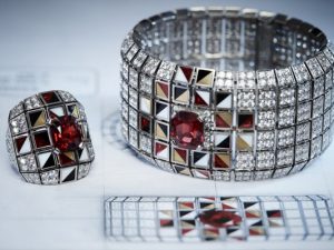 Сет Igor, посвященный композитору, выполнен в духе конструктивизма. В центре браслета из белого золота и бриллиантов — геометричный мотив в технике маркетри. Центральный камень — красная шпинель, окруженная мозаичной инкрустацией из рубинов, оникса, агата.