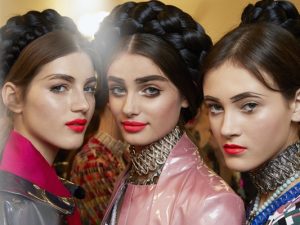 На контрасте с нейтральной кожей — активный рот и глаза. Для макияжа губ использовался карандаш цвета фуксии Le Crayon Levres N°55 и яркая помада в тон Rouge Allure Velvet L’Éclatante N°42, сделавшая манекенщиц похожими на героинь театральных подмостков.