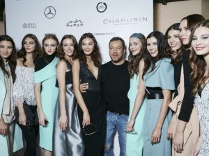 Традиционно отдавая предпочтение натуральным материалам — принтованному шелку, перуанскому хлопку и нескольким видам льна, Чапурин создает подчеркнуто-женственные образы, не лишенные, однако, силы и внутреннего стержня. На подиуме преобладали платья различной длины с геометричными вырезами и подчеркнутой зоной лифа, брючные комплекты в стиле smart casual, а также любимые дизайнером комбинезоны, выполненные в деликатной весенней гамме. Цвета сезона — размытые, будто слегка припыленные: холодный лимонный и мерцающий серебристый, ментоловый, цвет морской волны, насыщенный песочный и приглушенный бордо. Ярким контрастом в палитре выступает глубокий черный — цвет летнего неба, на котором мерцают звездочки-пайетки.