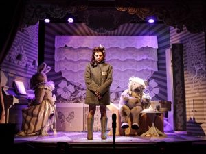 Декорации — пряничный домик, которым управляет хозяйка, этакая нарумяненная кукла с буклями, корсетами и пышными юбками: то ли повзрослевшая Алиса из Страны Чудес, то ли Мария-Антуанетта в плену собственных фантазий. Но хрупкий иллюзорный мир, в котором живет героиня, не выдерживает натиска реальности: за окнами с видом на Кремль одна за другой разворачиваются драмы, горят в огне бумажные стены…