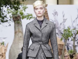 Открывал показ «серый» блок, в котором традиционные женственные коды Дома воплощались через интерпретацию стиля сафари, в исполнении Марии Грации Кьюри прозвучавшего подчеркнуто элегантно и утонченно. Образы, будто сошедшие с архивных снимков 1940-х-1960-х годов, сочетали в себе изысканный крой, акцентирующий внимание на достоинствах фигуры — острых ключицах, узкой талии, округлых бедрах, с современным пониманием комфорта: вместо так и просящихся изящных лодочек — грубые ботинки и лоферы на плоском ходу, а к ним — перчатки из тончайшей кожи, шляпа (но скорее одолженная у мужа, чем своя), очки-авиаторы.