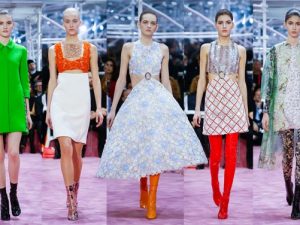 Раф Симонс бережно относится к наследию Кристиана Диора, перерабатывая классические силуэты и предметы гардероба, идет ли речь о платье new look или «барном» пиджаке, этих ключевых звеньях ДНК бренда. В новом сезоне дизайнер играет сразу с несколькими направлениями: это и обращение к классике, представленное сочетанием пышных юбок с укороченными топами, и тема 1960-х, нашедшая воплощение в комбинезонах, принтованных в духе оп-арта, трапециевидных платьях и укороченных пальто А-силуэта. Не обошлось и без столь любимого Симонсом футуризма: консервативные на первый взгляд модели дополнены прозрачными дождевиками, пластиковыми аксессуарами и глянцевыми сверкающими ботфортами, превращающими манекенщиц в героинь «Пятого элемента».