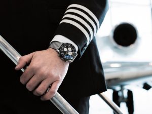 Практичная эстетика новой модели строится на контрастах — на черном безеле облегчающие управление вырезы в форме звезд и белые керамические цифры. Время во втором часовом поясе определяется даже беглым взглядом благодаря стрелке с красным кончиком и вращающему безелю со шкалой, разделенной на 24 часа. Показания хронографа отображаются на счетчиках, расположенных на 12, 9 и 6 часах. Циферблат вторит авиаприборам — белые люминесцентные метки на черном фоне, крупные часовая и минутная стрелки, люминесцентное покрытие на стрелках счетчиков максимально облегчают считывание показателей и создают ощущение ценности каждого мгновения.