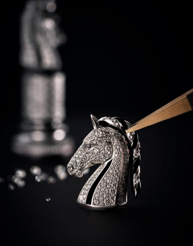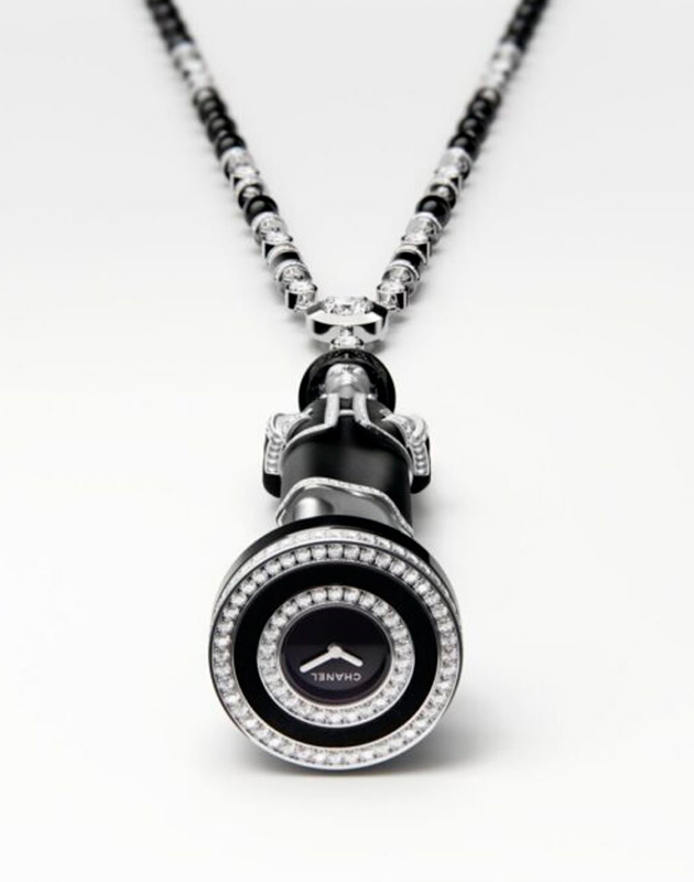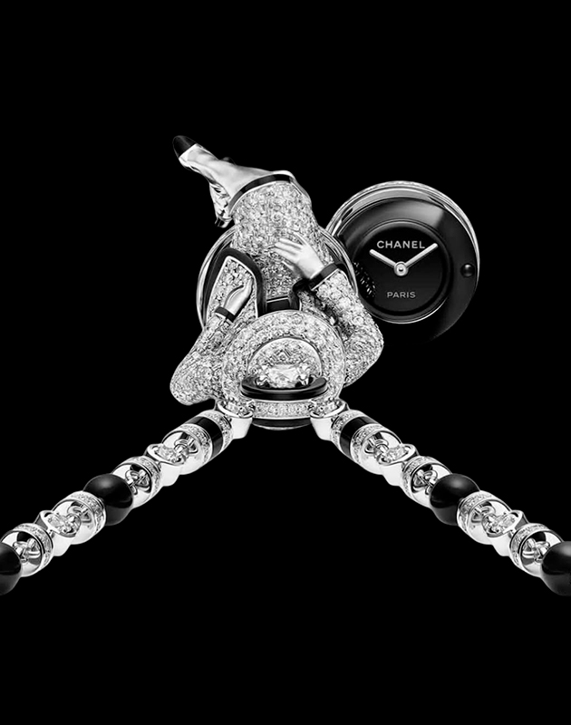 Ее фигура, доступная в черном и белом цветах, скрывает несколько неожиданных сюрпризов. В основании статуэтки разместились часы, выполненные из белого золота, бриллиантов и оникса. Для большей функциональности их можно носить как подвеску на ожерелье (для этого нужно повернуть шляпку Коко), а чтобы узнать точное время, достаточно заглянуть королеве под юбку.
