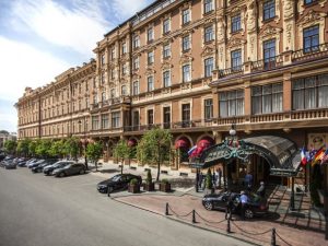 Фасад здания акционерного общества «Европейская гостиница», созданного в начале XIX в., изначально был выполнен по проекту Карла Росси, а затем был частично переделан архитектором Людвигом Фонтана в стиле нео-барокко.