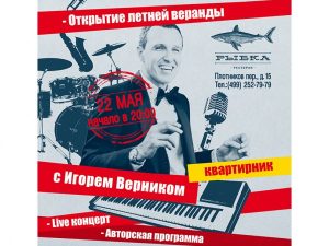 Игорь Верник, похоже, неравнодушен к кулинарным изыскам из даров моря — уже второй раз заслуженный артист России принимает участие в торжествах «Рыбки». Но если на дне рождения ресторана он был ведущим, то теперь — «первая скрипка»! Поклонников артиста будет ждать уникальный концерт — камерное исполнение собственных музыкальных композиций Игоря под аккомпанемент музыкантов его группы. Формат выступления близок возрождающейся традиции «квартирников»: дружеская атмосфера, живая музыка в небольшом уютном пространстве веранды. И, конечно, морские деликатесы от шеф-повара ресторана Бруно Марино.