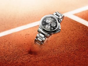 Маскулинный Conquest 1/100th превратился в элегантную, но динамичную феминную версию, оснащенную циферблатом антрацитового цвета с узором «солнечные лучи», оранжевыми стрелками и накладными индексами. Цветовая палитра тоже неслучайна и перекликается с оттенком легендарного покрытия теннисного корта «Ролан Гаррос». Принимая во внимание эмоциональность игры, часы представлены на браслете из нержавеющей стали с защитной застежкой.