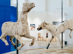 Итак, к искусству… Главная цель программы — поддержка свободного творчества, и эксперты Cosmoscow ежегодно выбирают художника, которому дают возможность подготовить проект специально для ярмарки. В этом году такая честь выпала Александре Гарт, которая представила произведение «Постоянство веселья и грязи» (название позаимствовано у Даниила Хармса), посвященное ускользанию времени и представляющее собой «карусель», тяжелый остов которой поддерживает размещенные по периметру фигуры коней. Кажется, что сейчас появится площадной зазывала, приглашающий на аттракционы и обещающий веселье, но аттракцион стоит немой…