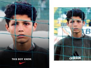 Нападающий мадридского «Реала» Криштиану Роналду отметил победу команды в Лиге чемпионов, выложив в твиттер свое подростковое фото с логотипом Nike. И все бы ничего, да только на исходном снимке будущая звезда мирового футбола позирует… в толстовке adidas.
