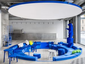 Пространство на Малой Ордынке, 19 — настоящая точка притяжения для всех, кто устал от бесконечной зимней серости и других «прелестей» коронавирусной реальности. Обилие яркого синего цвета, в котором буквально тонешь, как в океане, гигантская скульптура медведя и аромат кофе… Сам Гарри называет это место общественным пространством, где при этом должно быть комфортно и уютно, как в родном доме. Здесь можно назначать свидания, проводить время с книгой, вдохновляться (что особенно актуально для творцов!) и, конечно, заказывать смелые и неповторимые архитектурные проекты.