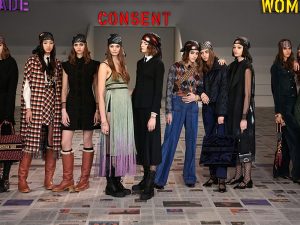Мария Грация Кьюри — феминистка со стажем, в каждой своей коллекции воспевающая женскую красоту и силу. На этот раз она подстраховалась: «дублировать» послание, зашифрованное в коллекции, должны были прямолинейные слоганы на стенах. «Когда женщины бастуют, жизнь останавливается». «Женщина — Луна, управляющая приливами». Пол был устлан копиями газет Le Monde: дизайнер готова защищать свои убеждения и на подиуме, и в прессе — что звучит особенно актуально сейчас, когда главный ньюсмейкер движения #MeToo Харви Вайнштейн признан виновным несмотря на настойчивые попытки откупиться.