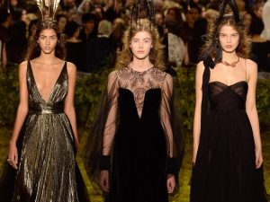 Что касается самой коллекции, то она была просто великолепной. Расшитые платья в пол, изящные кружевные вставки, фактурную вышивку и невероятные головные уборы — образы вновь и вновь пробуждали в памяти детские воспоминания о давно забытых волшебных историях. Особенно хочется отметить игру на контрасте: в кутюрной коллекции сезона весна-2017 преобладали мягкие, телесно-розовые и золотистые оттенки, однако было немало образов, выдержанных в темных тонах и несколько ярких всплесков цвета — например, красное платье из стеганной ткани. Иными словами, Мария Грация Кьюри знает, как заслужить овации зрителей. Кстати, в первом ряду я заметила немало звездных гостей, включая Диану Крюгер, Оливию Палермо и Кирстен Данст.