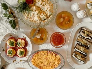 Уникальный совершенно ужин придумали два мишленовских шеф-повара — Евгений Викентьев («Белуга», 1 звезда Мишлен) и Артем Естафьев (ARTEST, 2 звезды Мишлен). Они реконструировали исторический царский обед XIX века в своей собственной авторской манере. Еще более невероятным меню делает то, что каждое блюдо для него придумано и проработано двумя шефами совместно.