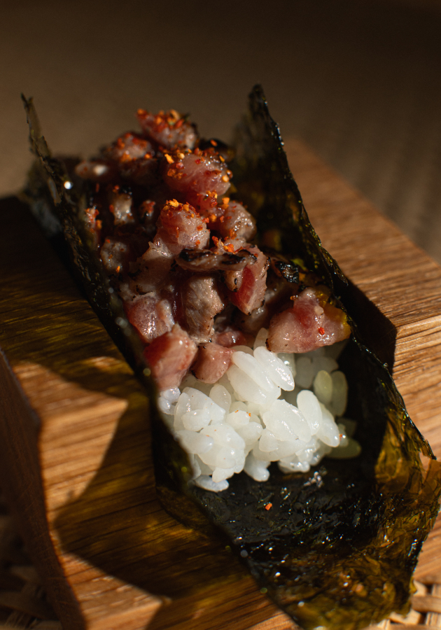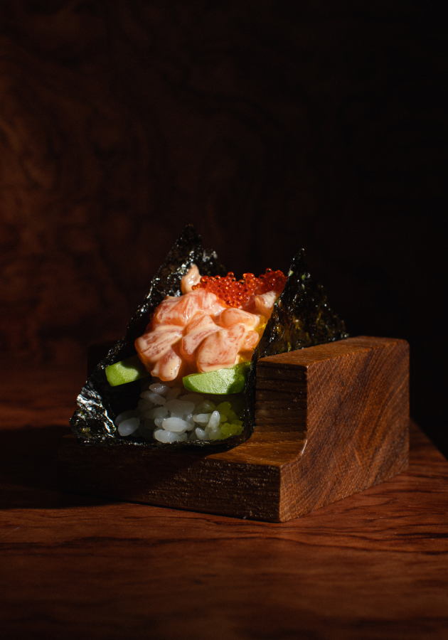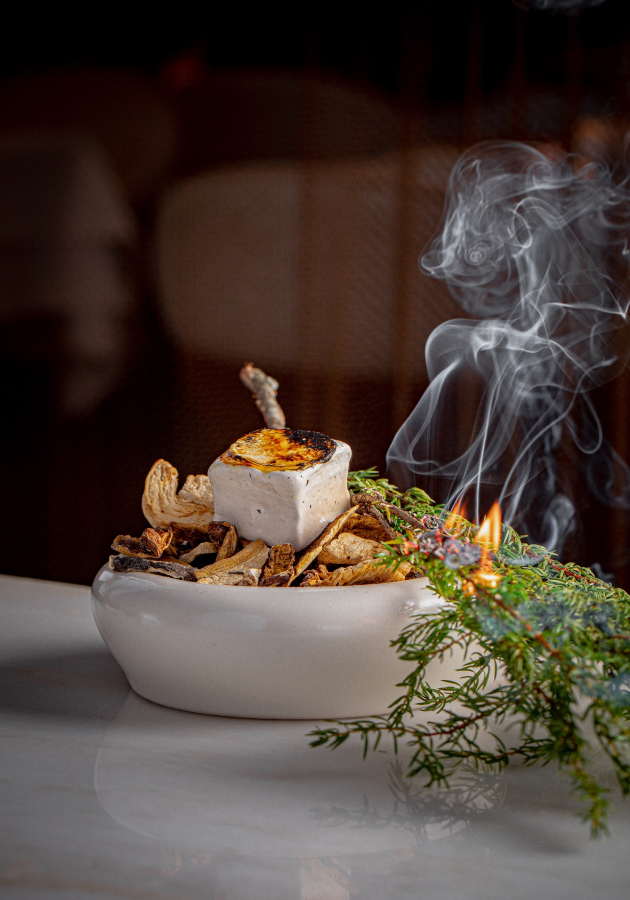 В качестве первой подачи – тартар из подкопченного оленя с чаем из грибов и ягеля. Вторым курсом подадут гребешок с печенью трески и хурмой. Продолжится знакомство с северной кухней сердцем оленя с топинамбуром и кедровой кашей, а также помакухой с крабом и морскими ежами: «помакуха» считается едой из остатков рыбы после разделки, а шеф соединил ее с премиальными морскими продуктами. Также в сете — беломорская корюшка с огуречником и черемшой, рыбник из солёной трески с гребешком и бульоном из водорослей и вырезка оленя с белыми грибами и морошкой. В финале — пастила из белых грибов и можжевельника и брусничное мороженое с морошкой и ржаными козулями.