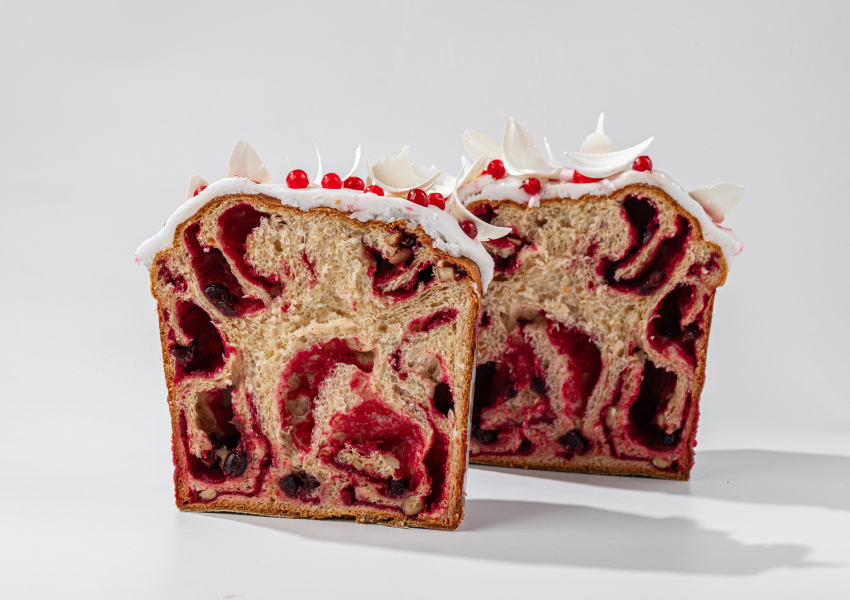 - Слоеный ягодный кулич с малиновым марципаном в качестве начинки
