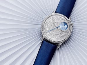 В коллекции — часы из 18-каратного розового золота или стали с автоматическим подзаводом, часы с индикатором фаз Луны с безелем, инкрустированным бриллиантами, и часы с индикатором фаз Луны и корпусом из белого золота, переливающегося 292 бриллиантами. Даная модель — отсылка к моде haute couture, в дополнение к вечернему образу — два сменных ремешка темно-синего цвета: один из кожи, второй из атласа.