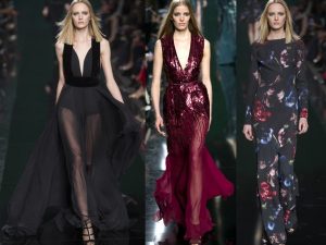 Итак, что нас ждет в следующем осенне-зимнем сезоне по версии Elie Saab? Черные, зеленые, бордовые платья и костюмы, цвета — очень глубокие и благородные, как всегда. Очень понравился переход нескольких тонов одного цвета, или так называемое омбре, от темного к светлому. Летящие шелковые платья, прозрачные — для смелых дам с идеальными фигурами, более классические, но не менее прекрасные. После лета, несомненно, захочется и меховой отделки — ее тоже можно найти в представленной коллекции.