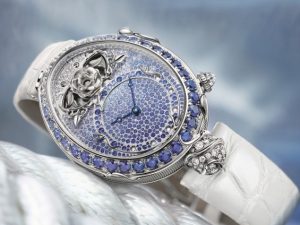 Ободок, средняя часть корпуса и ушки модели «Reine de Naples» speciale anniversaire декорированы 25 бриллиантами классической огранки и 27 синими сапфирами, а циферблат из посеребренного золота и его ободок инкрустированы 233 бриллиантами классической огранки и 303 синими сапфирами разных оттенков.