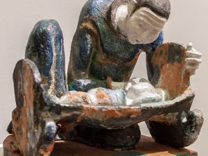 При входе в зал нас встречает женщина с ребенком на руках — деревянная композиция 1987 года «… Иди и свет мой сохрани». Одно из самых известных и пронзительных произведений Пологовой, которое и дало название выставке, поражает практически тактильным ощущением беззвучного разговора между женщиной и младенцем. В ней есть что-то от рублевской «Троицы» и архаичных идолов одновременно. Эта скульптура посвящена памяти матери художницы, которая умерла, когда та была еще подростком.