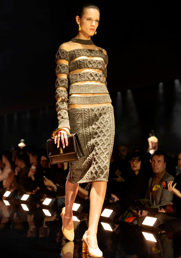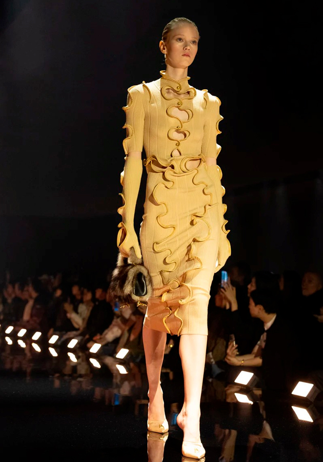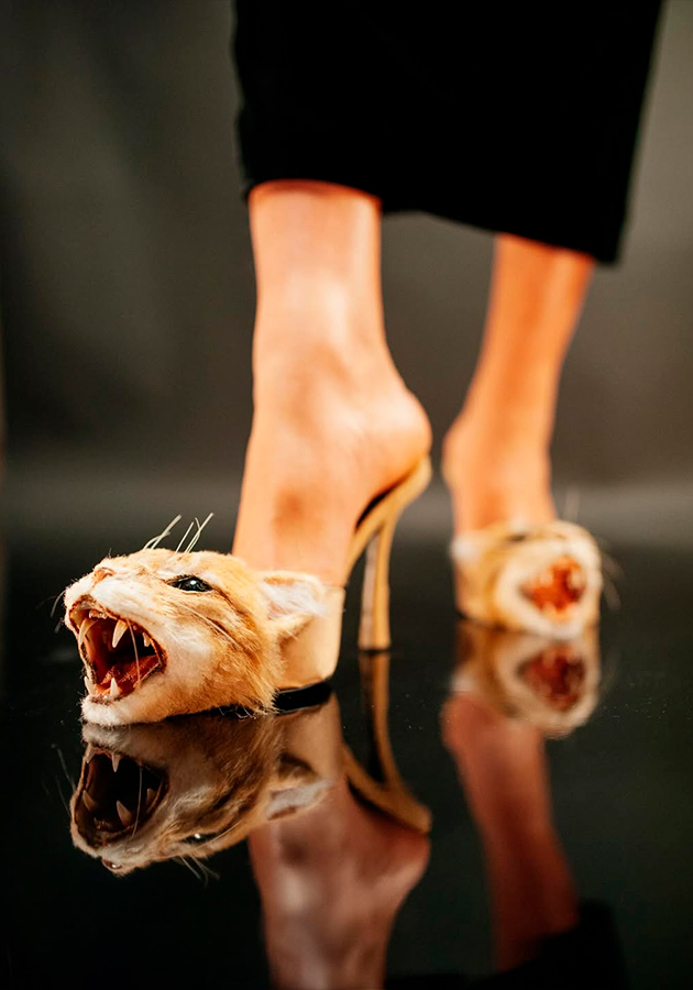 Фантазия дизайнера оживает в деталях: здесь и «хищные» украшения, и знаменитый «обезьяний мех», который Скиапарелли так любила использовать (в современной версии его заменили на овечью шерсть), и аксессуары: туфли с кошачьими мордами и сумки с собачьими — пугающе реалистичные, но выполненные из смолы и фетра. Коллекцию дополняют лапки цапли и птичьи силуэты, буквально «взлетающие» с кожаных ремней.