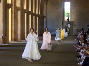 Дизайнер переосмыслил свое наследие, создав лаконичную, но чувственную коллекцию. Натуральные ткани сочетались с архитектурным кроем, а сдержанная палитра — с богатым декором: вышивкой, кружевом, кистями, объемными складками и драпировками.