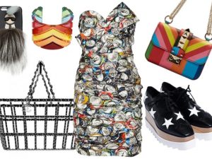 например, цветной искусственный мех, ботинки Stella McCartney, принтованные клатчи — вполне применимы и в обычной жизни.