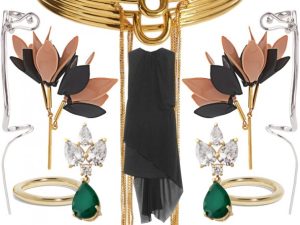 Многослойное платье Maison Margiela сложного кроя мы дополнили черными босоножками Gianvito Rossi на шпильке, яркими серьгами AMOVA Jewelry из коллекции Art Deco и тремя кольцами Jennifer Fisher из позолоченной меди. Этот наряд подойдет девушкам, предпочитающим сдержанные наряды: лаконичные кольца, классические босоножки и серьги смотрятся выигрышно на контрасте с асимметричным платьем и делают общий образ более сдержанным.