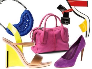Так хочется яркого солнца, зеленой травы и синего неба! Эту потребность с лихвой восполнят подарки ярких цветов — туфли цвета фуксия, зеленая сумка и синее украшение. А еще можно совсем развеселиться и подарить что-то сложное и многоцветное!