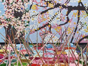 Первая музейная выставка Херста в Париже — уже событие, которое поклонники художника ждали с нетерпением, но интерес общественности к новому проекту активно подогревал и сам творец: выкладывал в Instagram* (*Meta Platforms Inc. (Facebook, Instagram) — организация, деятельность которой признана экстремистской, запрещена на территории Российской Федерации) фото и видео из лондонской мастерской, тем самым документируя процесс рождения Cherry Blossoms. И так в течение 61 недели! Постепенно щедрые пастозные мазки заполняли холсты, а мэтр строил забавные рожи, чтобы фолловеры не скучали. Процесс создания работ для новой выставки занял три года и завершился в ноябре 2020 года.